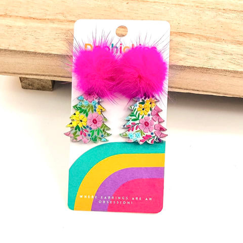 Add a dash of holiday whimsy with these Pom Pom Floral Festive Trees earrings. Featuring delicate pastel floral prints on lightweight acrylic, they bring a playful twist to classic Christmas style. Perfect for brightening your festive look with a fun, colorful touch!