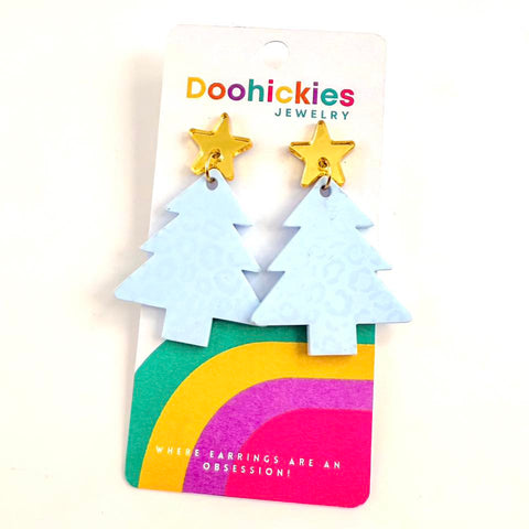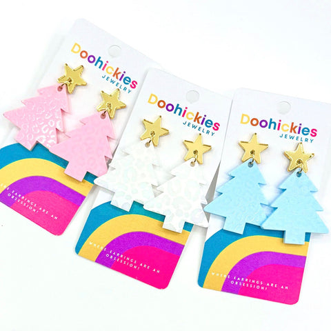 Add a festive touch with these playful Monotone Pastel Leopard Christmas Tree Earrings. Available in pink, white, or blue, each earring features a charming leopard print tree topped with a shiny mirror gold star. Perfect for holiday cheer with a stylish twist!